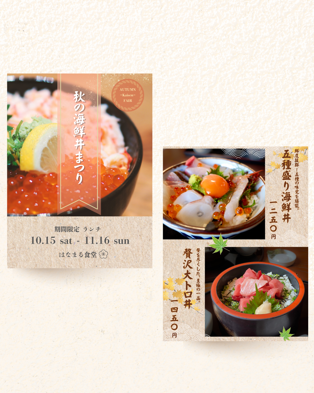 背景は和の素材で静かに写真を引き立たせる色合いに、海鮮丼の華やかさと食欲をそそるデザインにしました。